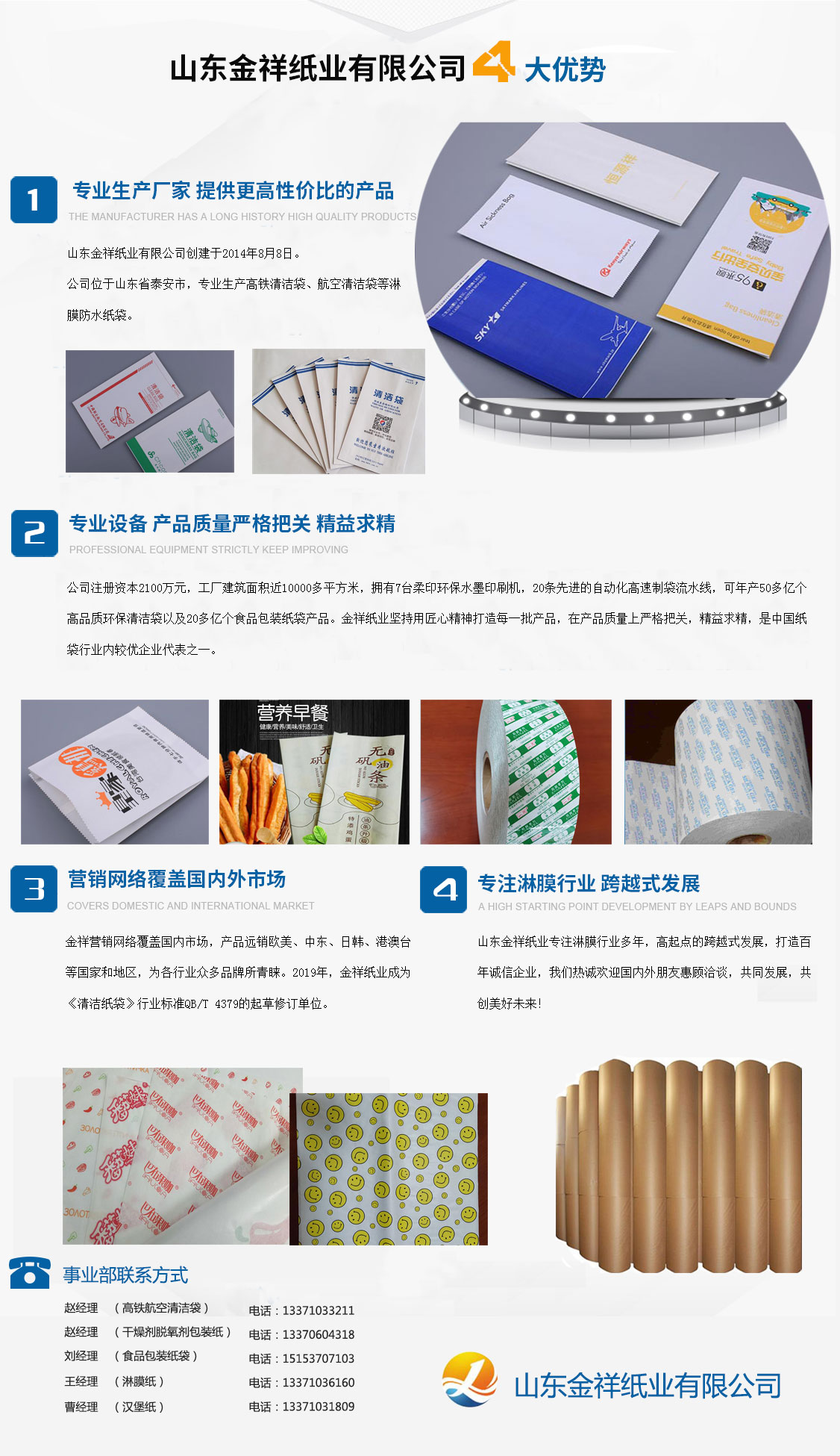 山東金祥紙業(yè)有限公司創(chuàng)建于2014年8月8日,公司位于山東泰安,專業(yè)生產高鐵清潔袋、航空清潔袋等淋膜防水紙袋。公司注冊資本2100萬元,工廠建筑面積近10000多平方米,擁有7臺柔印環(huán)保水墨印刷機,20條先進的自動化高速制袋流水線,可年產50多億個高品質環(huán)保清潔袋以及20多億個食品包裝紙袋產品。金祥紙業(yè)堅持用匠心精神打造每一批產品,在產品質量上嚴格把關,精益求精,是中國紙袋行業(yè)內較優(yōu)企業(yè)代表之一。金祥營銷網(wǎng)絡覆蓋國內市場,產品遠銷歐美、中東、日韓、港澳臺等國家和地區(qū),為各行業(yè)眾多品牌所青睞。2019年,金祥紙業(yè)成為《清潔紙袋》行業(yè)標準QB/T 4379的起草修訂單位。